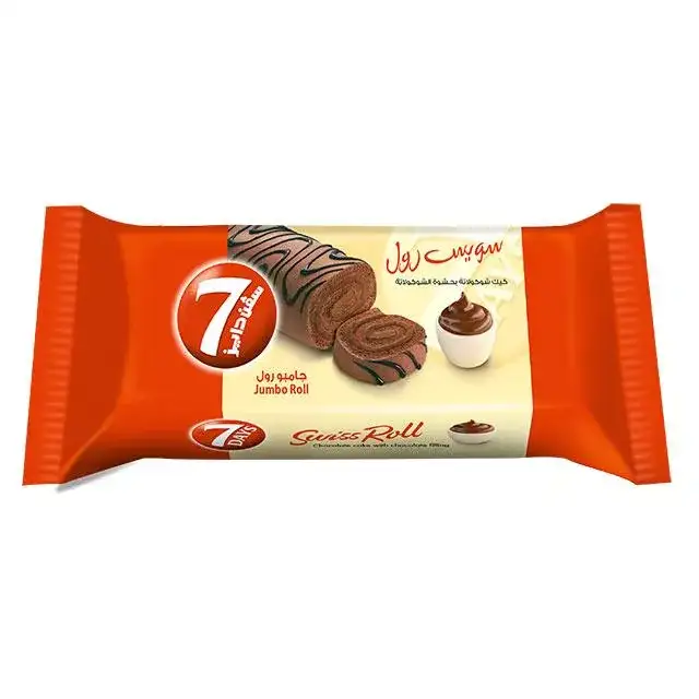سويس رول جامبو الشوكولاتة، من سفن دايز، حلوى خفيفة ولذيذة غنية بالطعم الذي تجده شهي مع حجم الجامبو الشوكولاتة، مما يجعله خيارك الانسب من الحلويات.
