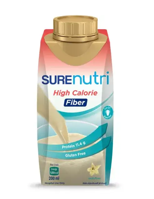 SureNutri Hi Calorie - Fiber is a nutrient dense complete balanced nutrition high in calories & proteins, suitable as a sole source of nutrition or for supplementation, for the dietary management of malnutrition for medical conditions requiring restricted fluid intake. Fortified with a blend of soluble Fibers for maintaining GIT Health.