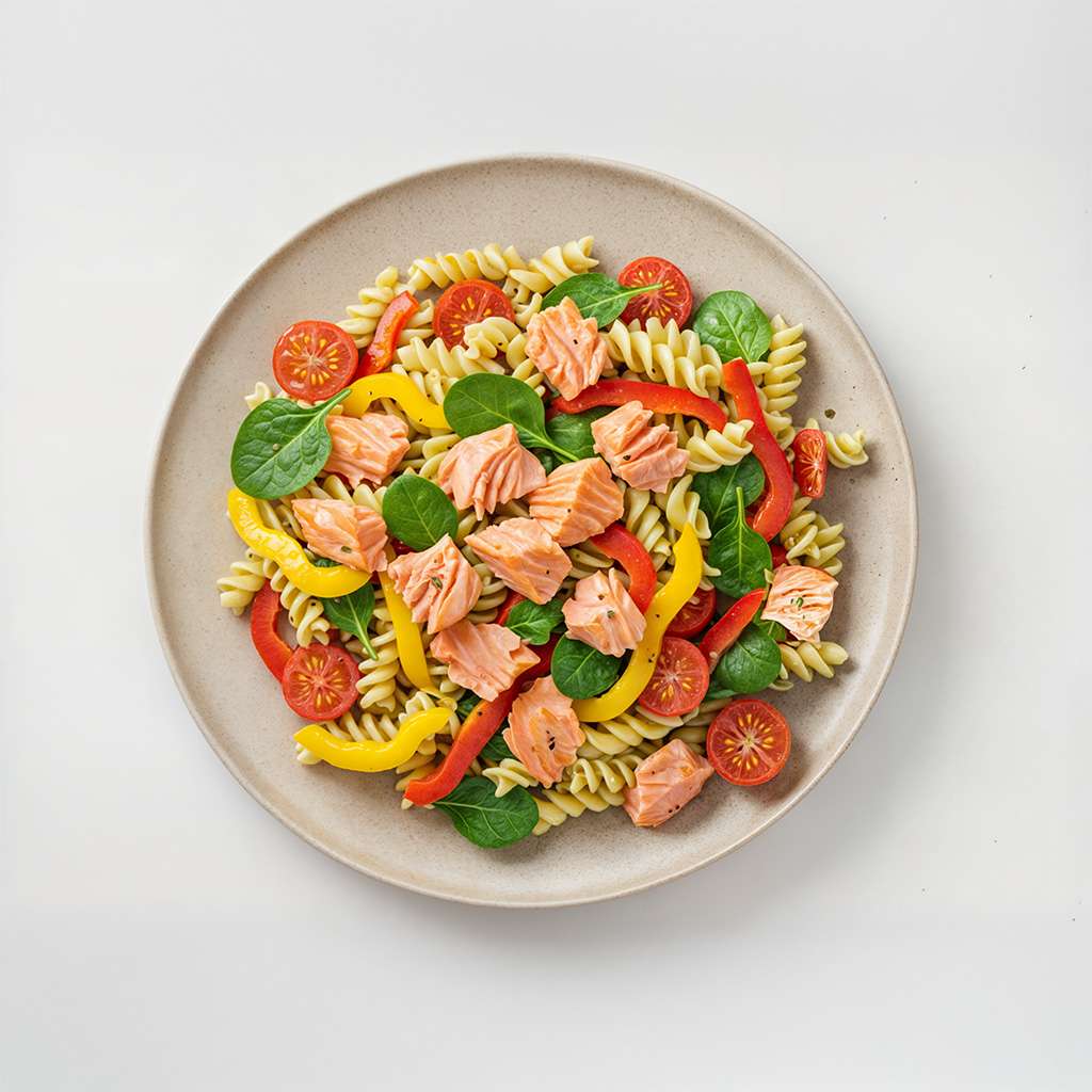 Delightful and nutritious dish that combines the rich flavors of Seama salmon with the freshness of vegetables and the heartiness of pasta.